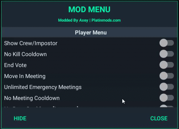Для android версии игры Among us имеется mod menu через которое вы сможете включить себе самый необходимый функционал который вам нужен в игре. Единственный плюс этого мода то что он идет вместе с apk, то есть вам нужно будет удалить старую версию игры, и установить эту, могу сказать что он уже взломанная, но вы сможете играть в онлайн режиме.